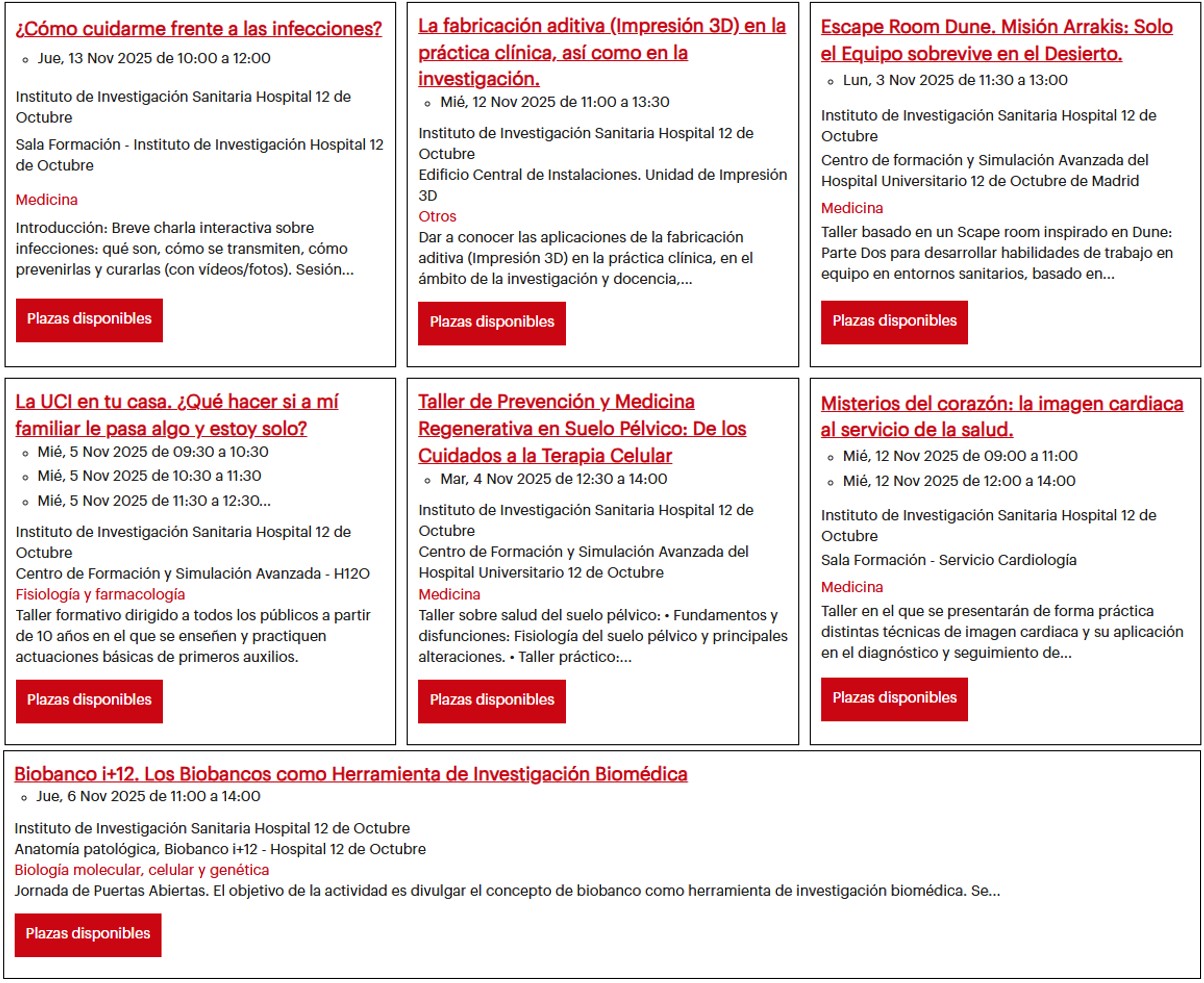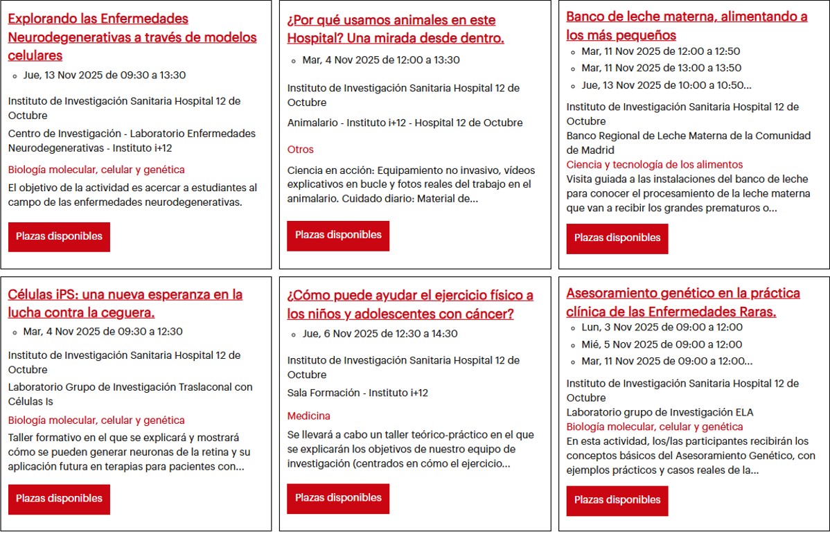 El Instituto de Investigación Hospital 12 de Octubre (i+12), a través de su Unidad de Apoyo a la Innovación, se une un año más a esta iniciativa con una amplia programación de actividades que permitirá a los asistentes descubrir de cerca cómo se hace ciencia en el hospital y conocer algunos de los avances más destacados en investigación biomédica.